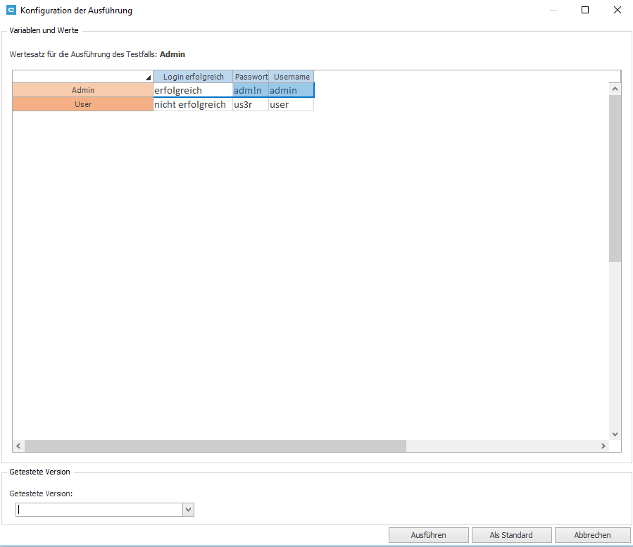 Nachdem Sie den Schrittplaner geschlossen haben, können Sie die Testausführung starten. Ein neues Fenster öffnet sich und Sie können den Wertesatz auswählen, indem Sie eine bestimmte Zeile anklicken.