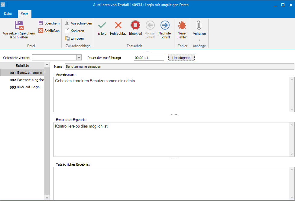 Ein Testfall kann über Testdaten parametrisiert werden. Dieses Beispiel zeigt einen Login, bei dem verschiedene Benutzerdaten in die Anmeldemaske eingetragen werden müssen. Öffnen Sie den Schrittplaner eines Testfalls und klicken Sie dann auf den Variablen Manager in der Ribbon Bar: