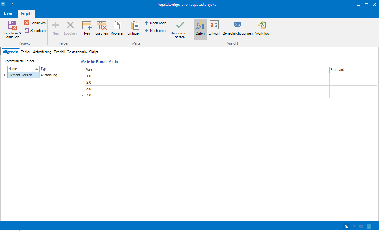 Die Werte für die Element-Version können editiert werden, indem man die entsprechenden Buttons benutzt. Zusätzlich kann ein Standard-Wert für alle neu-erstellten Elemente gesetzt werden. Metrische Skalen (z.B. 3.4 oder 5.0) und nicht-metrische Codenamen (z.B. 4.0 Beta, Lollipop, Jelly Beans) können verwendet werden. Um eine neue Version eines Elements zu erstellen, wählen Sie dieses Element in der Navigation aus und wählen Neue Version erstellen im Kontextmenü.