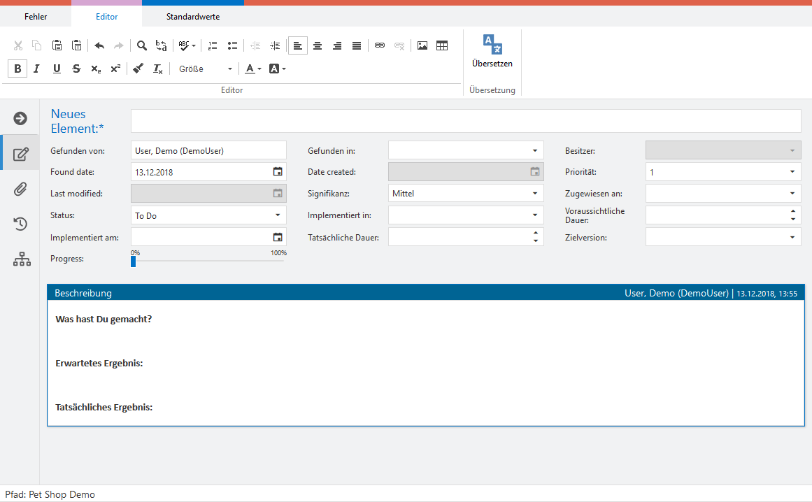 Um eine Vorlage zu erstellen, erstellen Sie zunächst ein neues Element. Definieren Sie die Standardwerte, zum Beispiel für Zugewiesen an und Signifikanz, sowie den Standardtext.