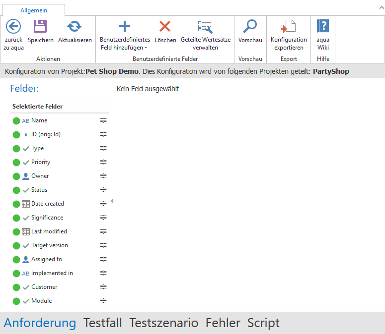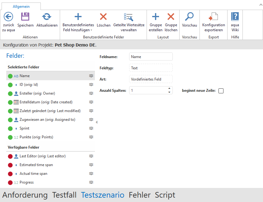 Jedes aqua Projekt implementiert eine Vorlage, welche die Konfiguration Ihres Projekts definiert. Indem Sie die Vorlage bearbeiten, können Sie das Layout und die Dialogfelder für die folgenden Elemente anpassen: Fehler, Anforderungen, Testfälle, Testszenarien und Skripte. Es gibt zwei Feldtypen – vordefinierte Felder und benutzerdefinierte Felder. Vordefinierte Felder sind standardmäßig konfiguriert und können vom aqua Benutzer nur teilweise angepasst werden. Benutzerdefinierte Felder können hinzugefügt werden, wenn zusätzliche Felder für eine individuelle Spezifikation benötigt werden.