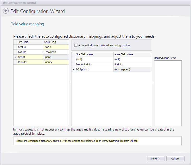 Bitte entscheiden Sie, wie Sie mit geschlossenen Syncs umgehen wollen, bevor Sie den sync starten. Wird ein Sprint in Jira geschlossen, möchten Sie diesen vielleicht in aqua deaktivieren.