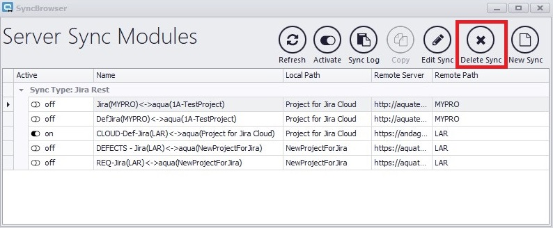 Um bestehende Syncs zu aktivieren oder deaktivieren, klicken Sie entweder auf das Schaltersymbol neben dem Sync-Namen, oder Sie selektieren einen Sync und klicken auf Activate.