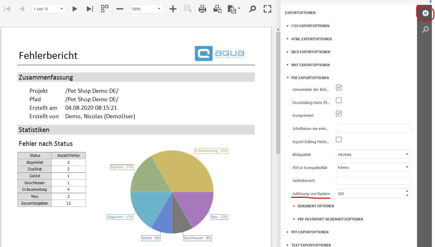 Wenn Sie einen Bericht exportieren und als PDF speichern wollen und die Auflösung der enthaltenen Diagramme nicht hoch genug für Ihre Bedürfnisse ist, können Sie einfach in den Exportoptionen die Auflösung erhöhen. Hierfür klicken Sie in der Exportansicht auf das Konfigurationsrad oben rechts und tragen unter "PDF Exportoptionen" bei "Auflösung von Rastern" die gewünschte Auflösung ein (z.B. 300 dpi).