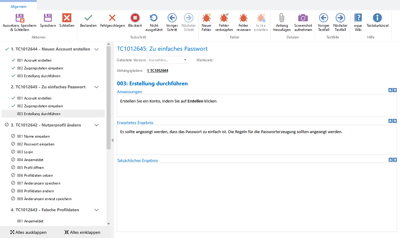 Detaillierte Informationen bezüglich der letzten Ausführungen finden Sie im Reiter Ausführungen. Hier sind alle bisherigen Ausführungen tabellarisch aufgelistet. Sie können die Ausführungen dann noch fortfahren, als irrelevant setzen, abbrechen oder finalisieren, genauso wie bei den Ausführungsergebnissen in den Testfällen selbst.