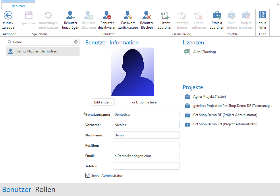 Die Seite der Benutzerverwaltung öffnet sich. Hier können Sie Ihre Projekte und Nutzer mit verschiedenen Rollen und Rechten verwalten. Sie können im Reiter Benutzer neue Nutzer über einen Assistenten hinzufügen, Lizenzen zuweisen oder Projekte zuweisen. Außerdem haben Sie eine gute Übersicht, in welchen Projekten welcher Nutzer arbeitet. In dem Reiter Rollen können Sie alle Rollen verwalten und neue Rollen erstellen.