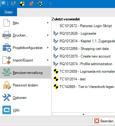 Um Nutzern den Zugriff und die Arbeit mit einem Projekt zu erlauben, müssen Sie diese dem Projekt als Projektmitglieder zuweisen. Starten Sie die Benutzerverwaltung, indem Sie auf Datei klicken und Benutzerverwaltung vom Menü auswählen. Bitte beachten Sie, dass Sie die entsprechenden Rechte benötigen.