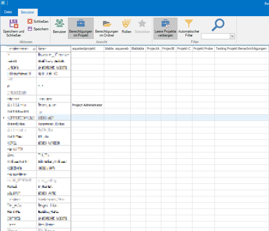 Über die Ansicht "Berechtigungen im Projekt" können Sie einen Benutzer einem Projekt zuzuweisen. Dafür wählen Sie die entsprechende Zelle aus und wählen eine Rolle, die der Benutzer im Projekt innehält. Rollen können in der Ansicht "Rollen" definiert werden.