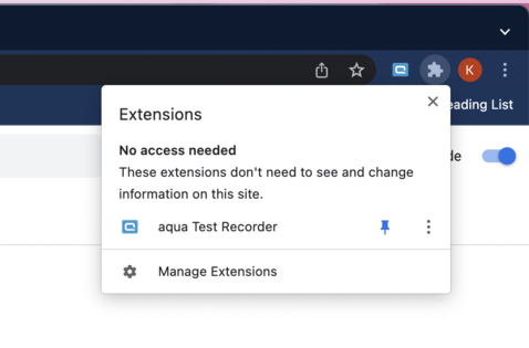 Sobald der Ordner hochgeladen ist, wird dieser zur Liste der ChromeErweiterungen hinzugefügt. Klicken Sie auf das Symbol "Erweiterungen" und heften Sie den aqua Test Recorder an. Das aqua-Symbol wird in der Symbolleiste der Erweiterungen angezeigt.