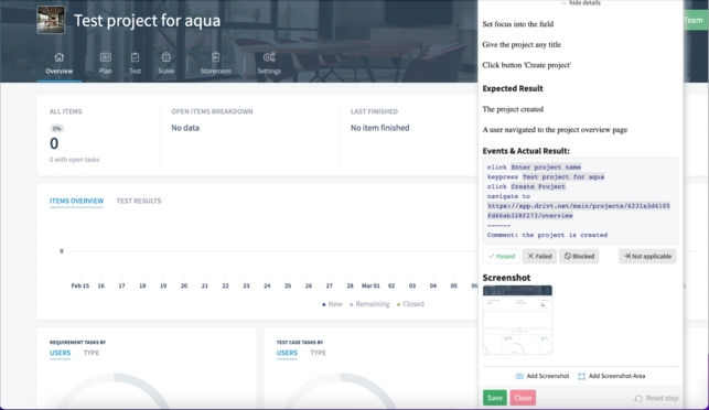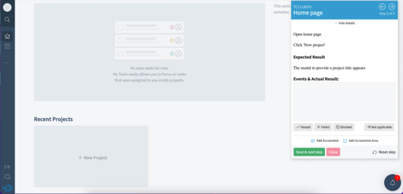 Sobald Sie den Schritt getestet und alles Notwendige dokumentiert haben, sollten Sie den entsprechenden Status setzen: Bestanden, Fehlgeschlagen, Blockiert oder Nicht anwendbar.