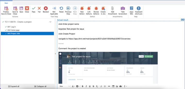 Um die Daten an aqua zu übergeben, müssen Sie jedes Mal, wenn Sie den Testschritt beenden, explizit auf die Schaltfläche "Speichern" klicken. Wenn Sie den Prüfschritt speichern, erscheint er in der aktiven Testausführung in aqua unter "Tatsächliches Ergebnis".