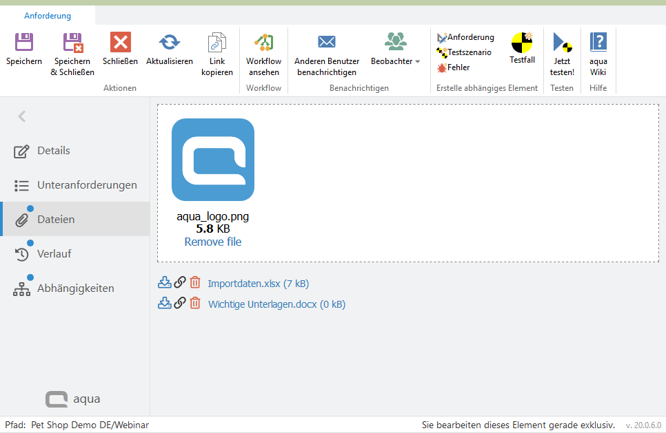 Sie können Anhänge zu Elementen oder Ausführungen in aqua Web hinzufügen. Dafür öffnen Sie ein Element und klicken auf Dateien in der Navigationseiste auf der linken Seite. Hier können Sie einfach Ihre Dateien hineinziehen oder in den grauen Bereich klicken, um nach einer Datei zu suchen. Nach dem Speichern können Sie die angehängten Dateien jederzeit wieder herunterladen, löschen oder einen Link zu der Datei in die Zwischenablage kopieren und verschicken oder zur Referenz in andere Elemente kopieren (z.B. können so die Anhänge eines Testfalls in einem der Testschritte referenziert werden, um sie bei der Testfallausführung leicht zugänglich zu machen).