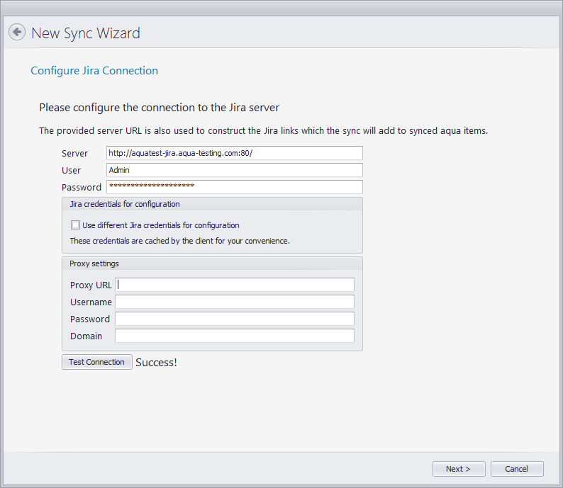 Alle nötigen Schritte wurden vorgenommen, also kann der Sync nun konfiguriert werden. Dafür Loggen wir uns mit unserem persönlichen User im SyncConfigurator ein. Mittels Klick auf 'New Sync' starten wir die Konfiguration. Im ersten Fenster wählen wir 'Jira Rest'. Im zweiten Fenster tragen wir die nötigen Informationen unseres Jira Systems ein.