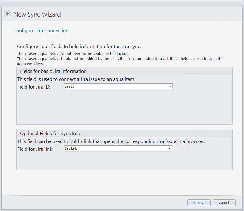 Der Sync erkennt die Felder für Jira Id und Jira Link automatisch. Wir können diese noch ändern, tun dies aber nicht, weil der Vorschlag passt.