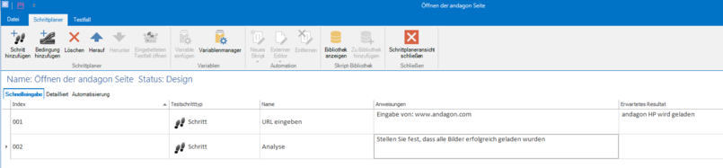 Speichern Sie den Testfall und erstellen einen neuen mit dem Namen Öffnen der andagon Seite. Dieser hat zwei weitere Testschritte.