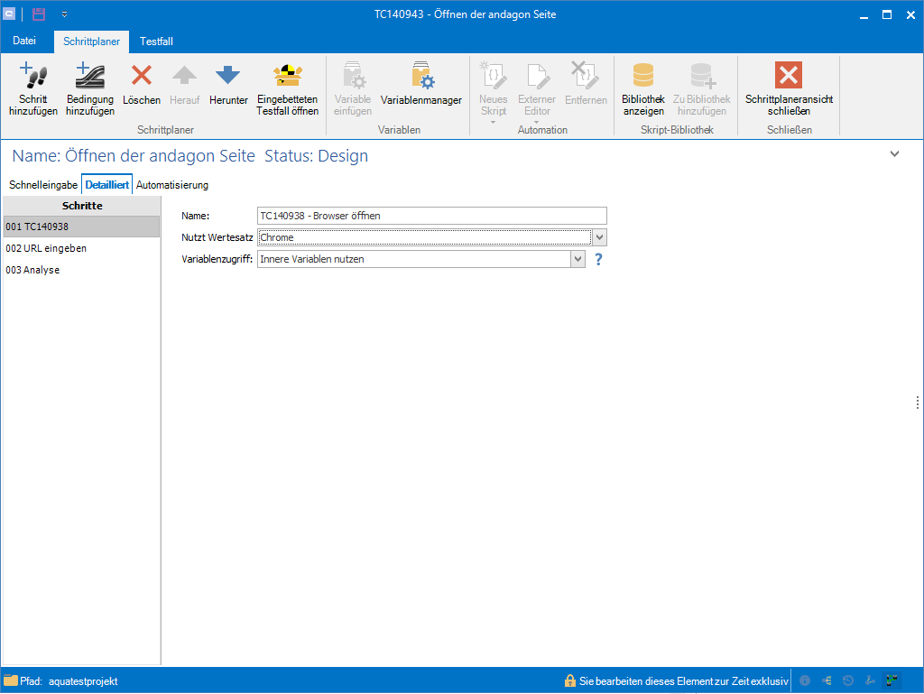 Um unsere Testschritte des Testfalls Browser öffnen im aktuellen Testfall Öffnen der andagon Seite. einzubauen, gehen Sie zurück zur Navigation und fügen den Testfall über Drag&Drop in unsere Testschritte ein. Sie werden das folgende Ergebnis erhalten. Um die richtige Reihenfolge zu erhalten, ziehen Sie den eingebetteten Testfall auf die erste Stelle.