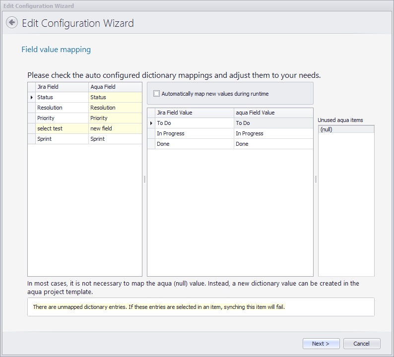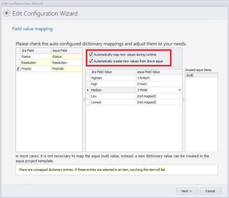 Normalerweise müssen Sie keine NULL Werte aus aqua verknüpfen. Bitte stellen Sie sicher, dass für alle Auswahlfelder ein Standardwert definiert ist. Außerdem ist es wichtig, Jira NULL Werte mit einem passenden aqua Wert zu verknüpfen. Werte mit ähnlichen Namen werden während der Syncerstellung automatisch verknüpft. Dennoch sollte die Zuordnung immer überprüft werden.