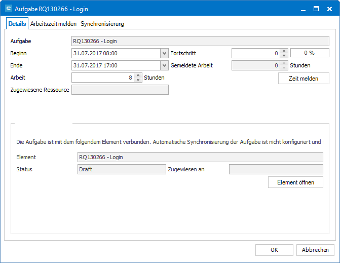 Nun wechseln Sie zum Tab Synchronisierung. Hier können Sie wählen, welcher Status die Fertigstellung des Elements definiert.