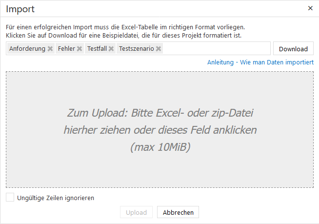 In dem Importdialog können Sie als erstes eine Beispieldatei in dem korrekten Format für das ausgewählte Projekt herunterladen. Hier können Sie noch auswählen, welche Elemente Sie importieren möchten. Zu jedem Elementtyp wird dann jeweils ein Arbeitsblatt in Excel erstellt, in welches Sie die zu importierenden Daten einfügen können. Zu beachten: wenn Sie nur Testszenarien auswählen wird zusätzlich immer noch ein Arbeitsblatt für Testfälle in der Beispieldatei hinzugefügt, da für den Import von Testszenarien auch immer die zugehörigen Testfälle gleichzeitig mit importiert werden müssen.