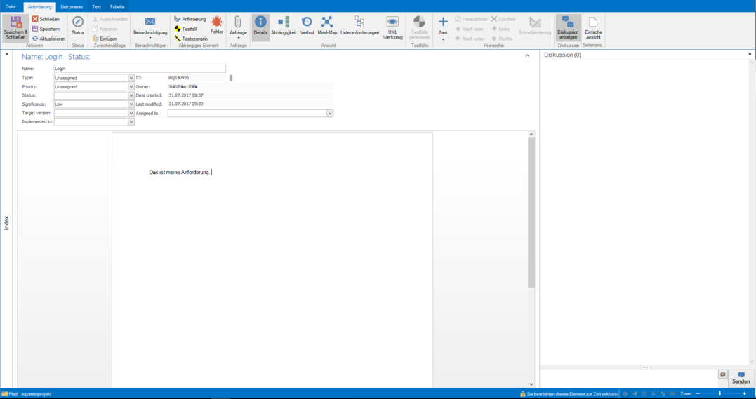 In den Anforderungen haben Sie die Möglichkeit, Ihren Fokus auf kollaboratives Arbeiten zu legen. Der Button Diskussion anzeigen erlaubt es Ihnen, eine neue Folie zu öffnen, in der Sie in einem Echtzeit-Chat mit anderen aqua Nutzern arbeiten können.