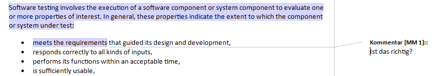 Nachdem Sie einen Textbereich ausgewählt und blau markiert haben, können Sie einen Kommentar über diesen Bereich hinzufügen. Machen Sie einen Rechtsklick auf das ausgewählt Element und klicken auf Neuer Kommentar im Kontextmenu.
