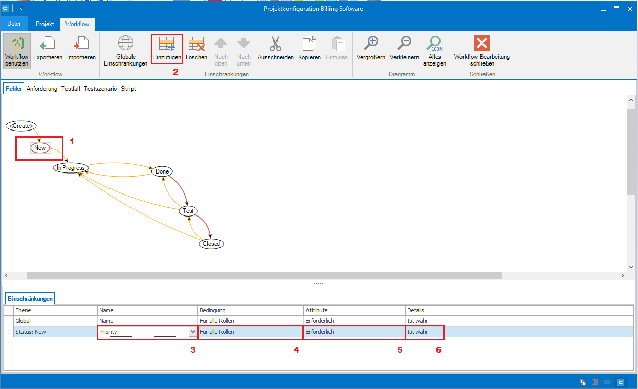 Um eine Statuseinschränkung für einen bestimmten Status zu erstellen, klicken Sie auf den Knoten dieses Status. Wir wollen, zum Beispiel, dass das Feld Priorität hervorgehoben wird, aber nur, wenn der Fehler den Status Neu hat. Um das zu tun, klicken Sie auf den Neu-Knoten und klicken auf den Button Hinzufügen im Einschränkungen-Panel, um eine Einschränkung hinzuzufügen. Die neue Einschränkung wird der Tabelle Einschränkung mit dem Status Neu hinzugefügt. Klicken Sie auf die Spalte Feld und wählen das Feld Priorität von der Liste der existierenden Felder aus. Der Wert der Spalte Bedingung sollte auf Für alle Rollen gesetzt werden, weil wir wollen, dass die Einschränkung für alle Rollen aktiv ist. Um das Feld Neu hervorzuheben, klicken Sie auf die Spalte Attribut und wählen Hervorgehoben. In diesem Fall, wollen wir den Wert des Attributs nicht negieren, also sollte der Wert der Spalte Details Ist wahr bleiben.