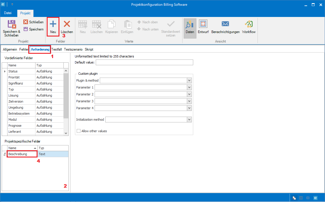 Wählen Sie den Tab Anforderung und klicken Sie auf benutzerdefinierte Felder. Um ein neues benutzerdefiniertes Feld hinzuzufügen, klicken Sie auf den Neu Button im Felder-Panel in der Ribbon Bar. Ein neues Feld vom Typ Text mit dem vorläufigen Namen Neues Feld wird im Bereich der benutzerdefinierten Felder erstellt. Klicken Sie auf den Namen des neuen Feldes und ändern es um in Beschreibung.