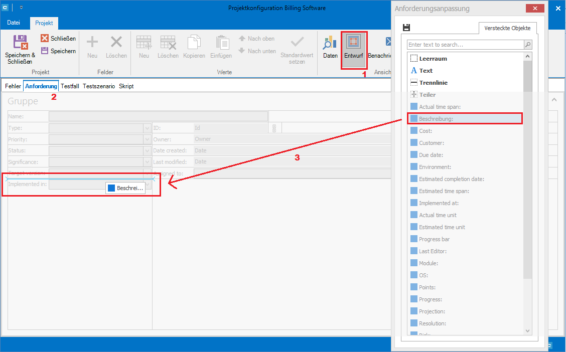 Das neue benutzerdefinierte Feld Beschreibung wurde nun erstellt. Um es anwenden zu können, muss das Feld in dem Dialog platziert werden. Dazu öffnen Sie den Layout Designer, indem Sie auf den Layout Button im Ansicht-Panel der Ribbon Bar klicken. Klicken Sie auf den Tab Anforderung, um das neue benutzerdefinierte Feld Beschreibung im Anforderungsdialog zu platzieren. Die angezeigte Toolbox enthält alle Felder, die diesem Dialog hinzugefügt werden können. Ziehen Sie den Eintrag des Feldes Beschreibung über Drag&Drop von der Toolbox in das Layout. Halten Sie die linke Maustaste gedrückt, bis der Eintrag an der gewünschten Position ist. Weitere Anpassungen im Layout können ebenfalls über Drag&Drop gemacht werden.