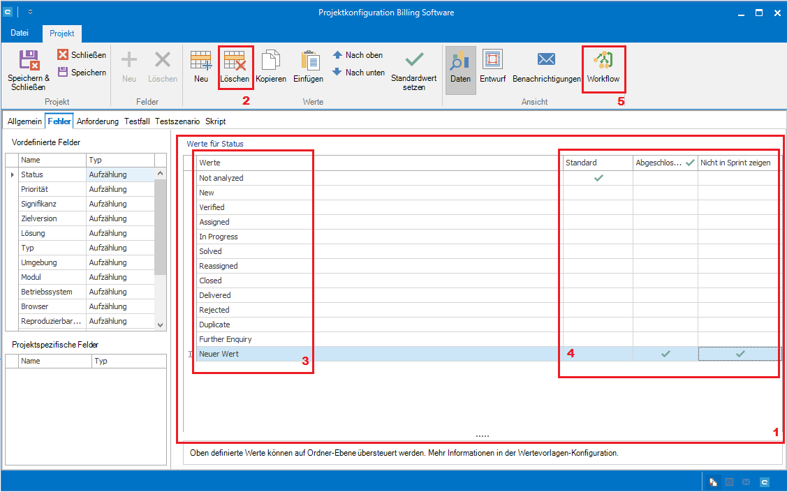 Klicken Sie in die Feldwerte für Status-Tabelle und klicken Sie fünf Mal auf den Neu Button, um fünf neue Feldwerte für das Feld Status hinzuzufügen. Klicken Sie einmal in die Werte-Zelle jedes neuen Werts und benennen Sie sie um in: Neu, In Bearbeitung, Fertig, Test und Abgeschlossen. Setzen Sie einen Haken für Standard im Wert Neu, für Abgeschlossen im Wert Abgeschlossen, für Nicht in Sprint zeigen auch im Wert Abgeschlossen. Der Haken für Nicht in Sprint zeigen ist gesetzt, sodass der Status Abgeschlossen nicht auf dem Sprint Board in Agile auftaucht. Wir haben nun fünf Werte für den Status von Fehlern erstellt. Um den Workflow für den Status zu konfigurieren, öffnen Sie den Workflow Designer, indem Sie im Ansicht-Panel der Ribbon Bar auf Workflow klicken (5).