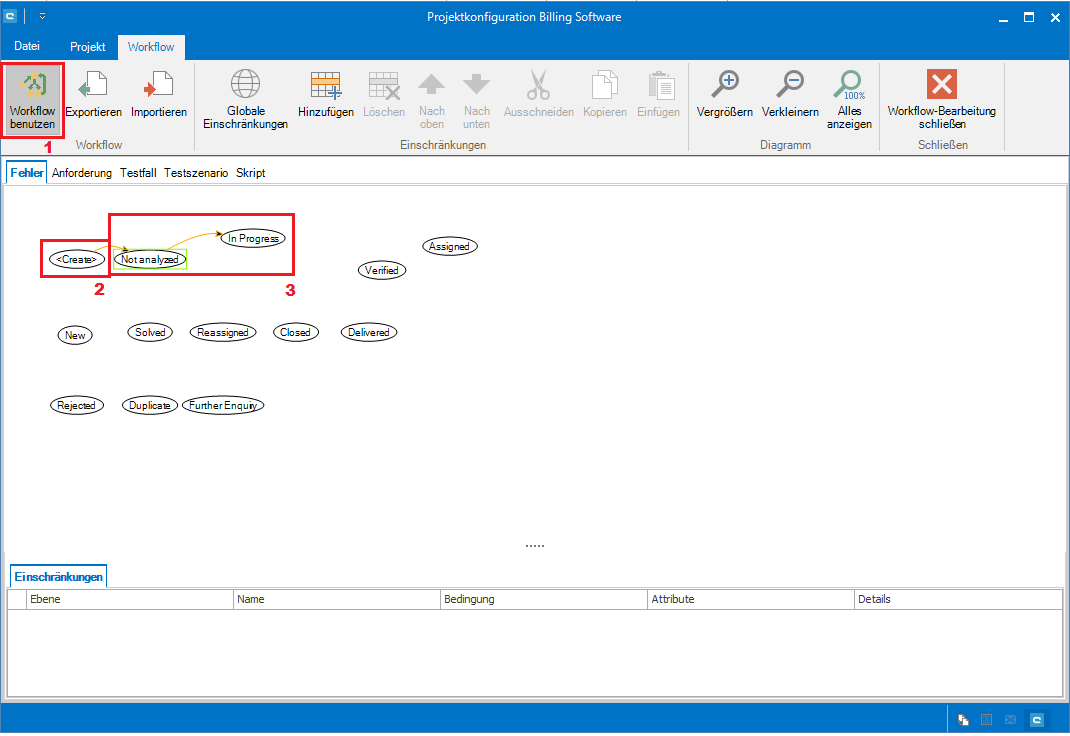 Die folgenden Einschränkungsarten sind möglich: globale Einschränkungen, welche für den gesamten Workflow definiert werden, Aktionseinschränkungen für die Übergänge zwischen Statusknoten und Statuseinschränkungen für einen bestimmten Status.