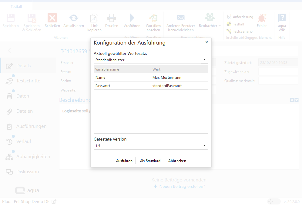 Ein neues Fenster öffnet sich, in dem Sie die getestete Version eingeben und einen Wertesatz auswählen können. Der Wertesatz ist im Variablen Manager beschrieben. Labels für die Testausführugng können verwendet werden, um Informationen über das zu testende System und die Testumgebung zu erfassen. Weitere Details finden Sie hier. Nachdem Sie (optional) die getestete Version eingegeben haben, klicken Sie auf Ausführen.