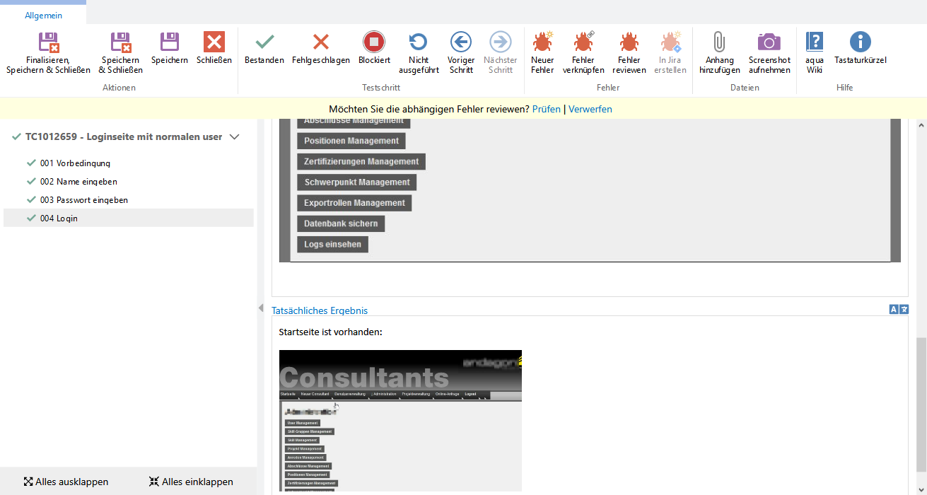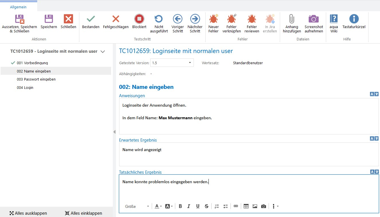 Ein neuer Tab zeigt Schritt für Schritt die Aufgaben an, die im Testfall durchgeführt werden müssen. Der folgende Screenshot zeigt einen Bedingungsschritt. Dokumentieren Sie das aktuelle Verhalten in Tatsächliches Ergebnis. Der Text kann wie in allen Beschreibungsfeldern auch formatiert werden und mit Tabellen oder Bildern erweitert werden (über die Werkzeugleiste in dem unteren Bereich des Ergebnisfeldes oder auch per Copy&Paste).