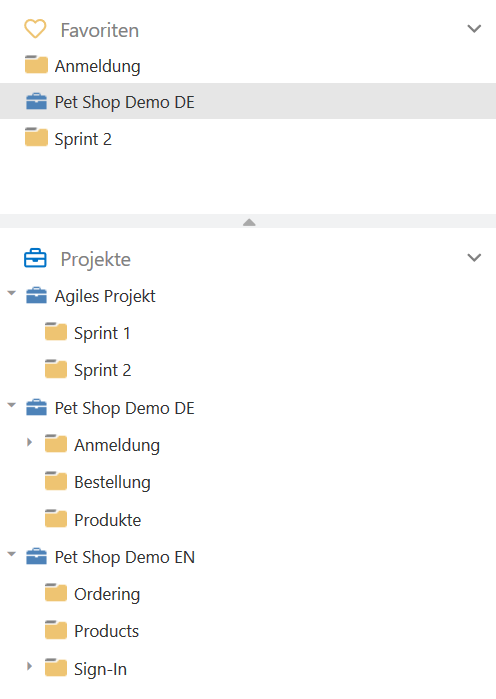 Auf der linken Seite befindet sich der Projektbaum mit den Ihnen zugewiesenen Projekten in blau sowie den darunter liegenden Ordnern in gelb. Benutzern werden nur die Projekte angezeigt, für deren Zugriff sie berechtigt sind. Die Ordnerstruktur eines Projekts enthält alle Arten von Elementen. Projekte sowie Ordner können als Favoriten gespeichert werden für einen schnellen Zugriff.