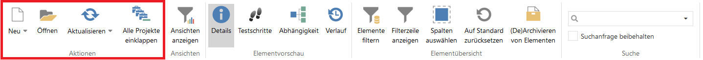Außerdem können Sie über den Menüpunkt Aktionen der Multifunktionsleiste (Ribbon) im oberen Bereich neue Elemente erstellen, Elemente öffnen, die Ansicht aktualisieren (nur den Inhalt oder auch die Projektliste sowie Ordner) oder auch alle Projekte einklappen.