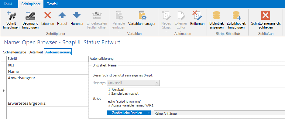 Um ein UnixShell-Skript in ALM auszuführen, erstellen Sie einen neuen Testfall, öffnen den Schrittplaner und wählen den Tab Automatisierung. Wählen Sie den Testschritt (Klick in das leere Feld des Schritts) und fügen ein neuen UnixShell-Skript über den Skript-Button hinzu.