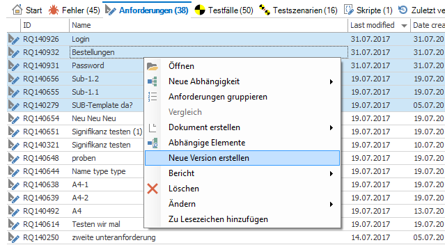 aqua bietet dem Benutzer die Möglichkeit, Versionen aller Elemente zu verwalten, wie Anforderungen, Fehler, Testfälle und Testszenarien. Dies erlaubt es Ihnen, prüffähige Anforderungen, Testfälle und Fehler zu speichern. Es ermöglicht Ihnen, mit verschiedenen Version von Elementen zu arbeiten und alte Dokumentenstatus von einzelnen Elementen wiederherzustellen. Änderungen können einfach vom Softwarezyklus verfolgt werden und werden visuell angezeigt. Neue oder alternative Versionen von Elementen können verwaltet werden.