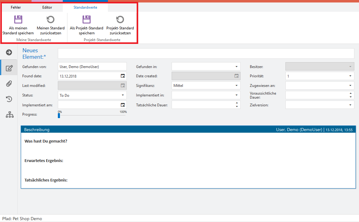 Um eine Vorlage zu erstellen, erstellen Sie zunächst ein neues Element. Definieren Sie die Standardwerte, zum Beispiel für Zugewiesen an und Signifikanz, sowie den Standardtext.