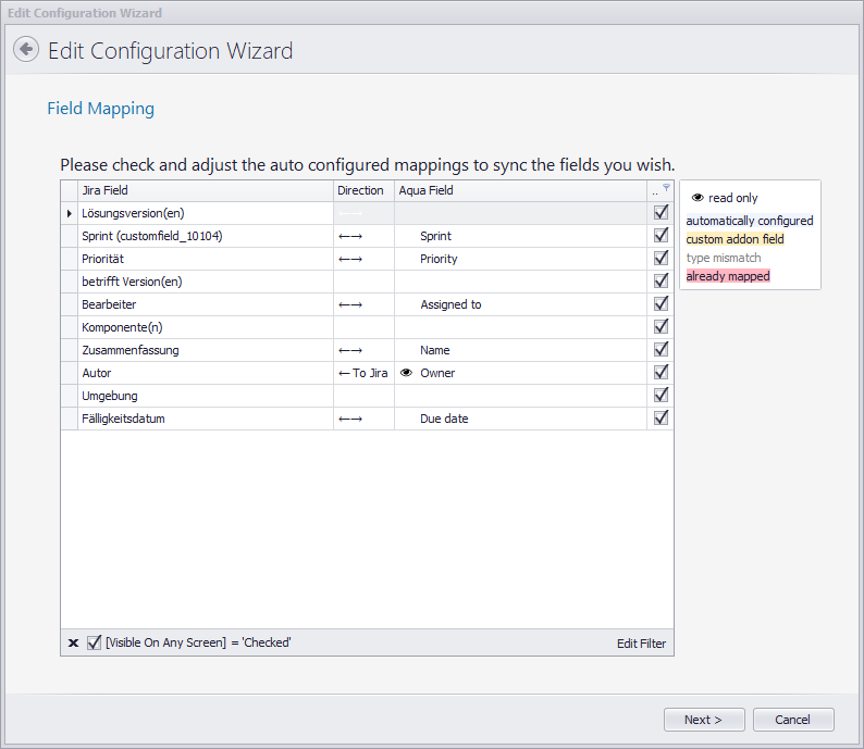 Bei den Sprintfeldern handelt es sich um einen besonderen Feldtyp. Wenn Sie sehen möchten, in welchem Sprint sich ein Element befindet, aber nicht den Sprint als solches syncen möchten, dann können Sie das Sprint Feld mit einem Feld vom Typ Auswahl verknüpfen.