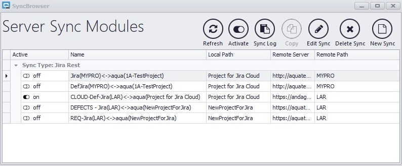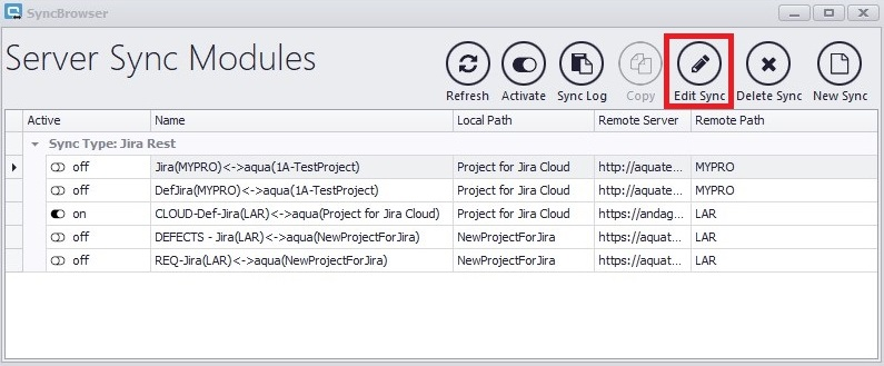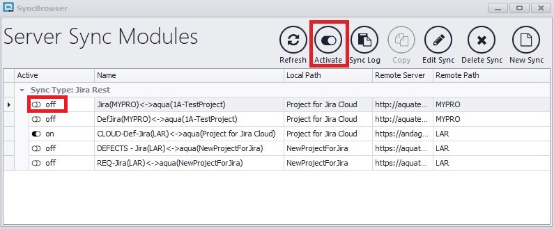 Um bestehende Syncs zu aktivieren oder deaktivieren, klicken Sie entweder auf das Schaltersymbol neben dem Sync-Namen, oder Sie selektieren einen Sync und klicken auf Activate.