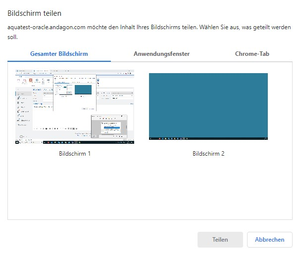 Abhängig vom verwendeten Browser, kommt als erstes eine Meldung welchen Bildschirm, Fenster oder Applikation Sie aufnehmen möchten.