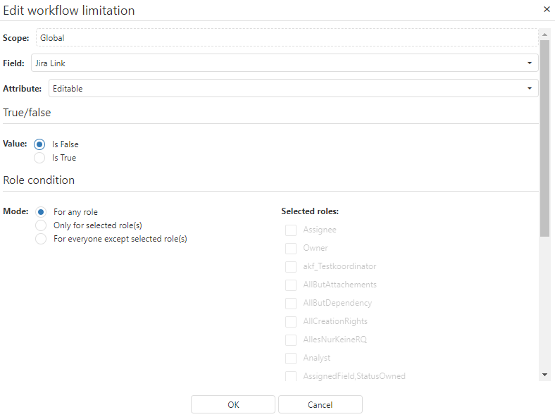 Durch den "Hinzufügen" Butten fügen wir Einschränkungen hinzu. Dadurch werden die Felder 'Jira Id' und 'Jira Link' schreibgeschützt.