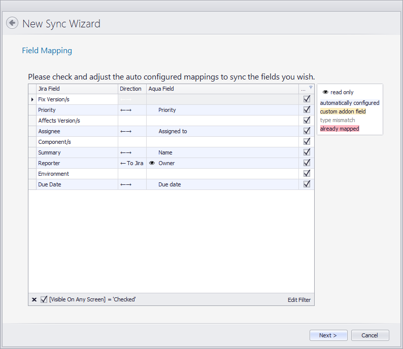 Der Sync erhält nun alle nötigen Informationen bezüglich unserer Jira Konfiguration und der verfügbaren aqua Projekte. Wir wählen, welches Projekt und welcher IssueType synchronisiert werden soll.