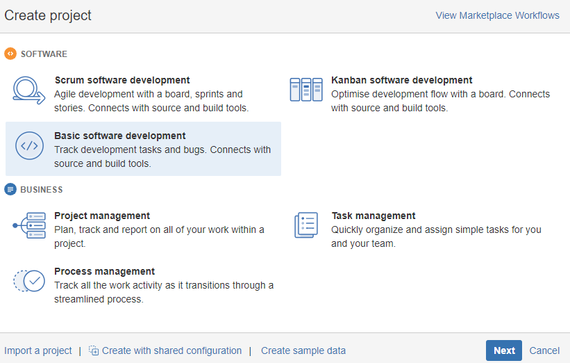 Wir erstellen ein Projekt in Jira, dessen Elemente zum aqua Projek 'Our first Jira Sync' synchronisiert werden. Wir wählen 'Basic software development'.