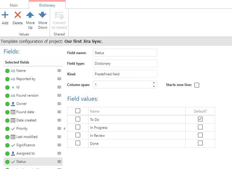 Zusätzlich fügen wir die Felder 'Jira Link' und 'Jira ID' als Textfelder hinzu. Klicken Sie auf den roten Kreis um die Felder der Vorlage hinzuzufügen. Hier fügen wir auch das Feld 'Resolution' mit den selben Werten wie in Jira hinzu, plus dem Wert 'Unresolved'. Dieses Feld fügen wir nicht zur Vorlage hinzu, da wir hier keine Werte manuell eintragen und das Feld in aqua nicht sehen müssen.