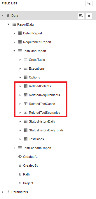 Innerhalb des hierarchischen Strukturbaumes gibt es Listen, Felder und berechnete Felder. Für jede Liste kann ein Band definiert werden, welches über die Elemente der Liste iteriert. Wird das übergeordnete Feld einer Liste direkt in den Report gezogen und kein Band dafür erstellt, so wird hierüber nicht iteriert, sondern lediglich das erste Element angezeigt. Dies wird nicht empfohlen. Berechnete Felder geben einen Wert auf Basis einer definierbaren Funktion zurück. Beispielweise kann ein berechnetes Feld erstellt werden, welches 1 zurückgibt, wenn eine Testausführung bestanden ist und 0, falls nicht. Dadurch können alle bestandenen Tests gezählt werden, ohne das ein aufwändiges Skript benötigt wird.