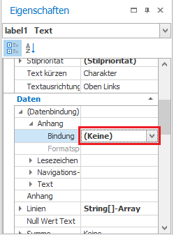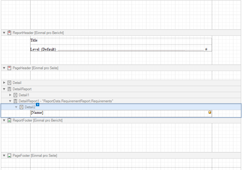 Dort definieren Sie die Bindung in (Datenbindung)->Lesezeichen. Dann definieren Sie dies, indem Sie Data->ReportData->RequirementReport->Requirements->Name benutzen.