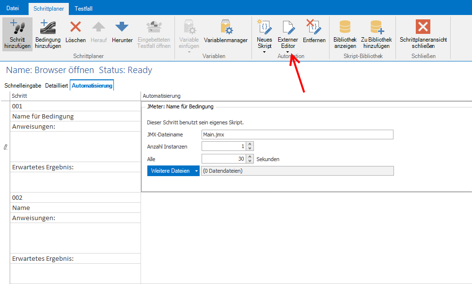 Zuerst öffnen Sie den Testfall und klicken auf Automatisierung. Hier können Sie ein JMeter Skript hinzufügen.