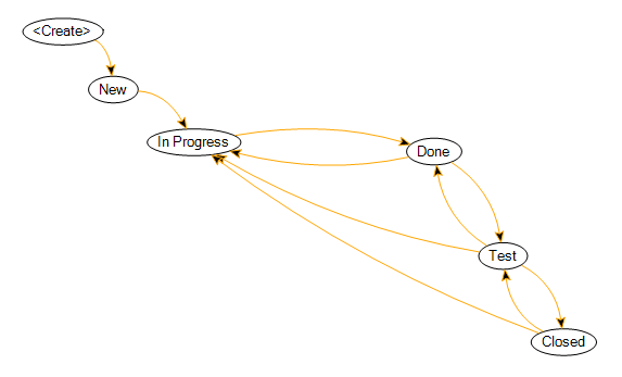 Wenn, zum Beispiel, ein Programmierer anfängt die Ursache des Fehlers zu beheben, ist der einzige nächstmögliche Status für den Fehler In Bearbeitung. Um diese Abhängigkeit zu konfigurieren, müssen Sie einen Übergang zwischen den Knoten Neu und In Bearbeitung erstellen. Um das zu tun, schieben Sie die Maus über die Ecke des Neu Knotens, wenn sich der Mauszeiger in eine gepresste Hand verwandelt und halten Sie die linke Maustaste gedrückt, ziehen Sie den Pfeil zum In Bearbeitung-Knoten und lassen die Maustaste los.