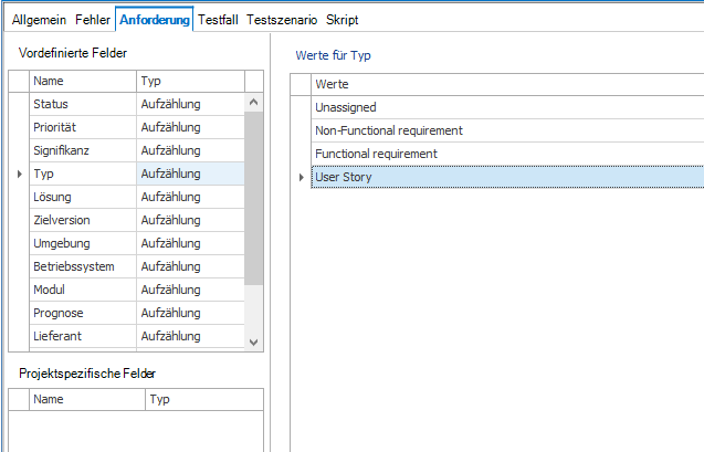 Um Anforderungen als Aufgabe oder User Story zu markieren, müssen Sie dies als Wert für den Typ in der Vorlage für Anforderungen hinzufügen.
