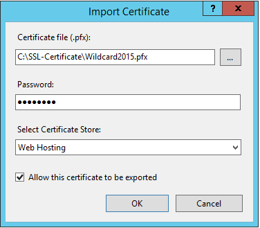 6. Wählen Sie das Zertifikat aus, geben Sie das Passwort ein, wählen Sie den Zertifikatsspeicher "Web Hosting" aus und (wichtig!) "Export dieses Zertifikats zulassen" (andernfalls schlägt es fehl)